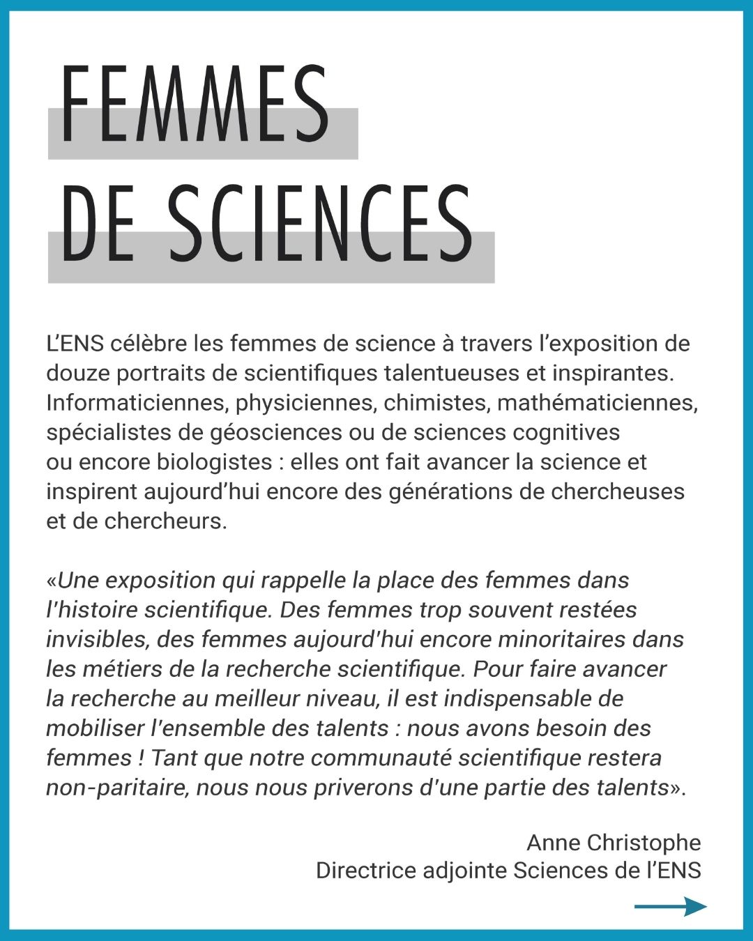 Mise en place par la Fondation ENS, cette exposition propose douze portraits de scientifiques talentueuses pour rappeler leur rôle crucial dans l'histoire et inspirer les nouvelles générations dans le but de rendre visibles des femmes trop souvent restées dans l'ombre et encourager la parité dans les métiers de la recherche.